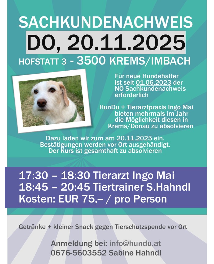 04.10.2025 Welttierschutztag – Tierschutzaktion bei HunDu KERZENFUNDGRUBE Sachkundenachweis JUNI 2025 Therapiebegleithundeprüfung Messerli Institut in Krems 03.10.2025 Veranstaltungen JUNI 2025 Tricks für Anfänger und Profis Juni 2025 NASENKURS JUNI 2025 Veranstaltungen April 2025 Therapiehundeprüfung Messerli Institut Frühlingstermin: 04.04.2025 in Krems Therapiehundetermine für laufende Teams, neue Gruppe bei Veranstaltungen Hund + Kind 09.05.2025 Fenstertag Schildkröten Tierheim – RespekTurtle 17.05.2025 Veganer Heuriger 17.05.2025 Sachkundenachweis Do, 12.06.2025